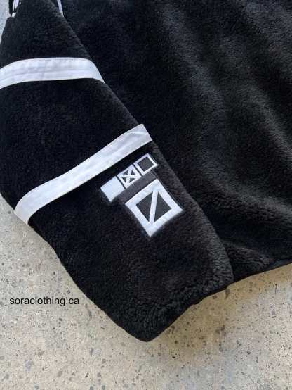 Heavyweight winter insulated sherpa jacket made of Teddy Fleece with embroideries on the front, sleeves, and straps on the left sleeve. Soft and comfortable, warm and breathable. Super Soft!