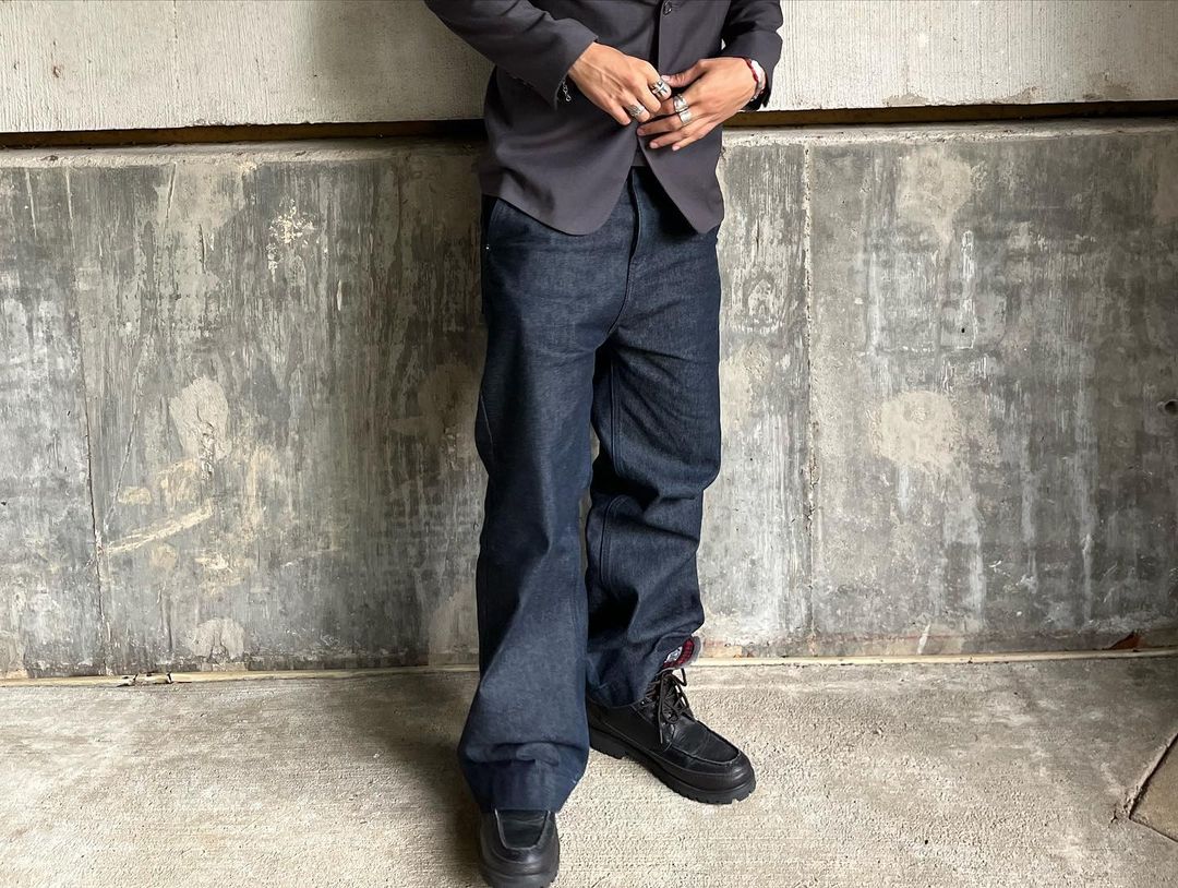15oz Raw Japanese Denim- Crafted in Los Angeles, California- 100% Cotton Raw Japanese Denim- 100% Full grain leather patch made locally in Texas- Features A wide leg, flared silhouette