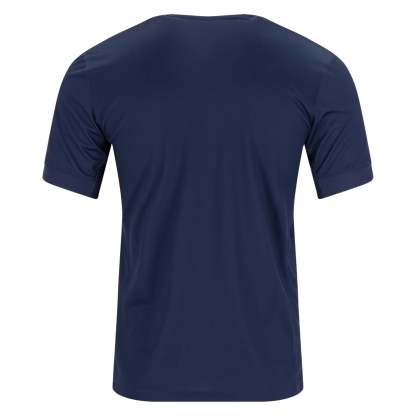 The home jersey features a navy blue base with bold red and white accents — a modern take on PSG’s traditional colors. The updated shield‑style crest adds a fresh twist while retaining unmistakable club identity for when Paris takes the road.
