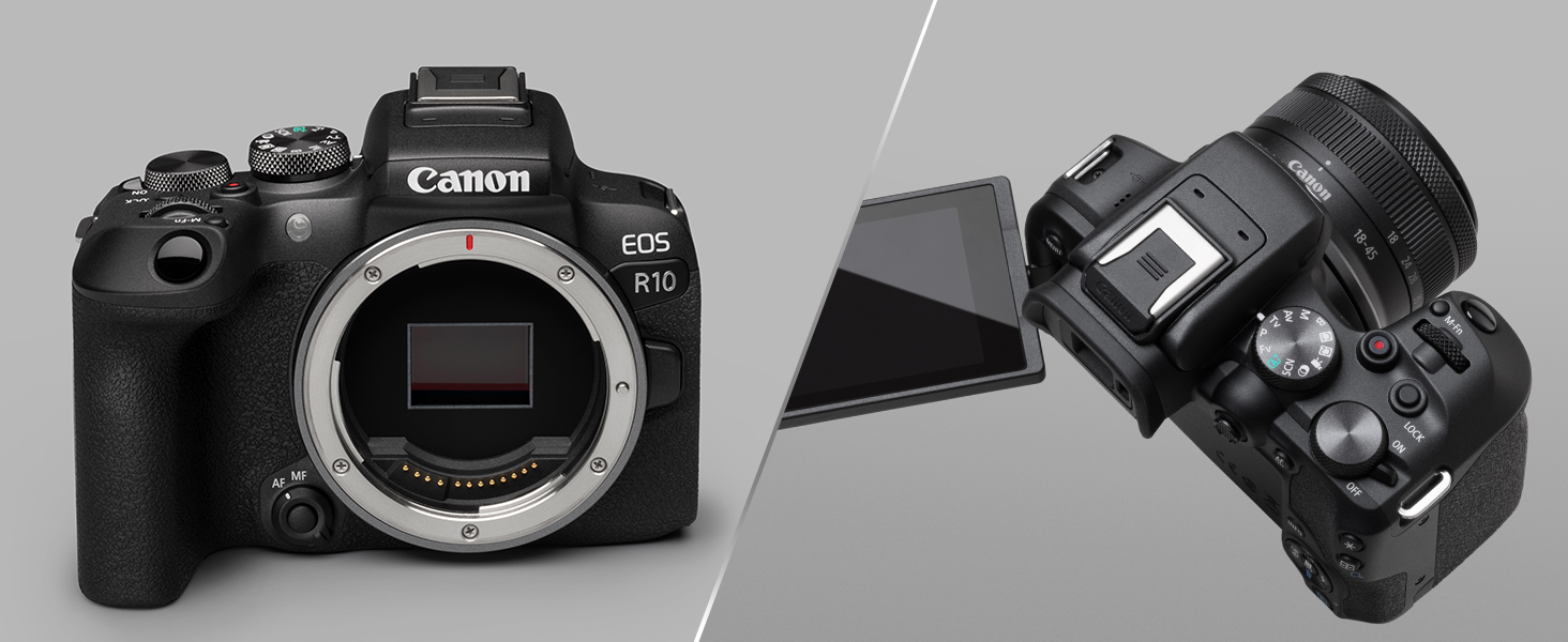 - WHAT’S INCLUDED: EOS R10 camera body,strap ER-EOSR10, battery charger LC-E17, battery pack LP-E17, battery pack cover, RF-S18-45mm F4.5-6.3 IS STM lens, lens cap E-49, lens dust cap RF, shoe cover