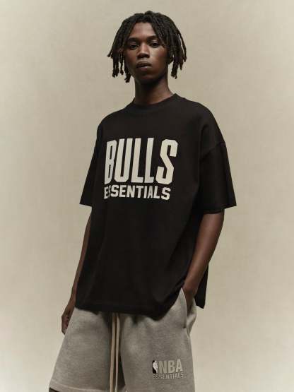 The Bulls short sleeve tee is crafted from core cotton jersey. It features a relaxed fit in the body with dropped shoulders and a rib-knit crewneck. On the front, there is a rubberized soft-touch "BULLS " lockup, along with the iconic NBA logo on the back. Additionally, a rubberized " " label is located at the back collar.