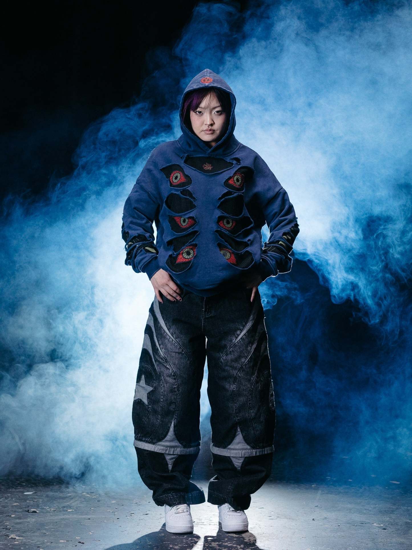 This is our hoodie made of two layers: black knit underneath, made of 100% cotton, and the top layer made of washed and thick French terry. The designs on the hoodie are embroidered on both sides to ensure the quality lasts forever!