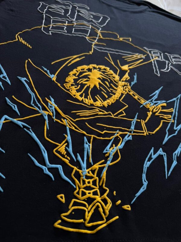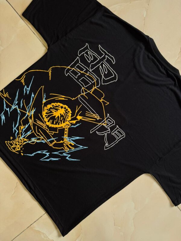 Inspired by the Thunder Breather who strikes faster than the eye can follow this oversized drop-shoulder tee crackles with energy The bold golden yellow base is cut from heavyweight 100% cotton built for comfort and durability while carrying that unmistakable flash of Zenitsu’s spirit The back puff print channels his lightning-fast form while the front embroidery keeps it subtle until the storm hits The relaxed drape makes it perfect for laid-back days or sudden bursts of action when the moment calls