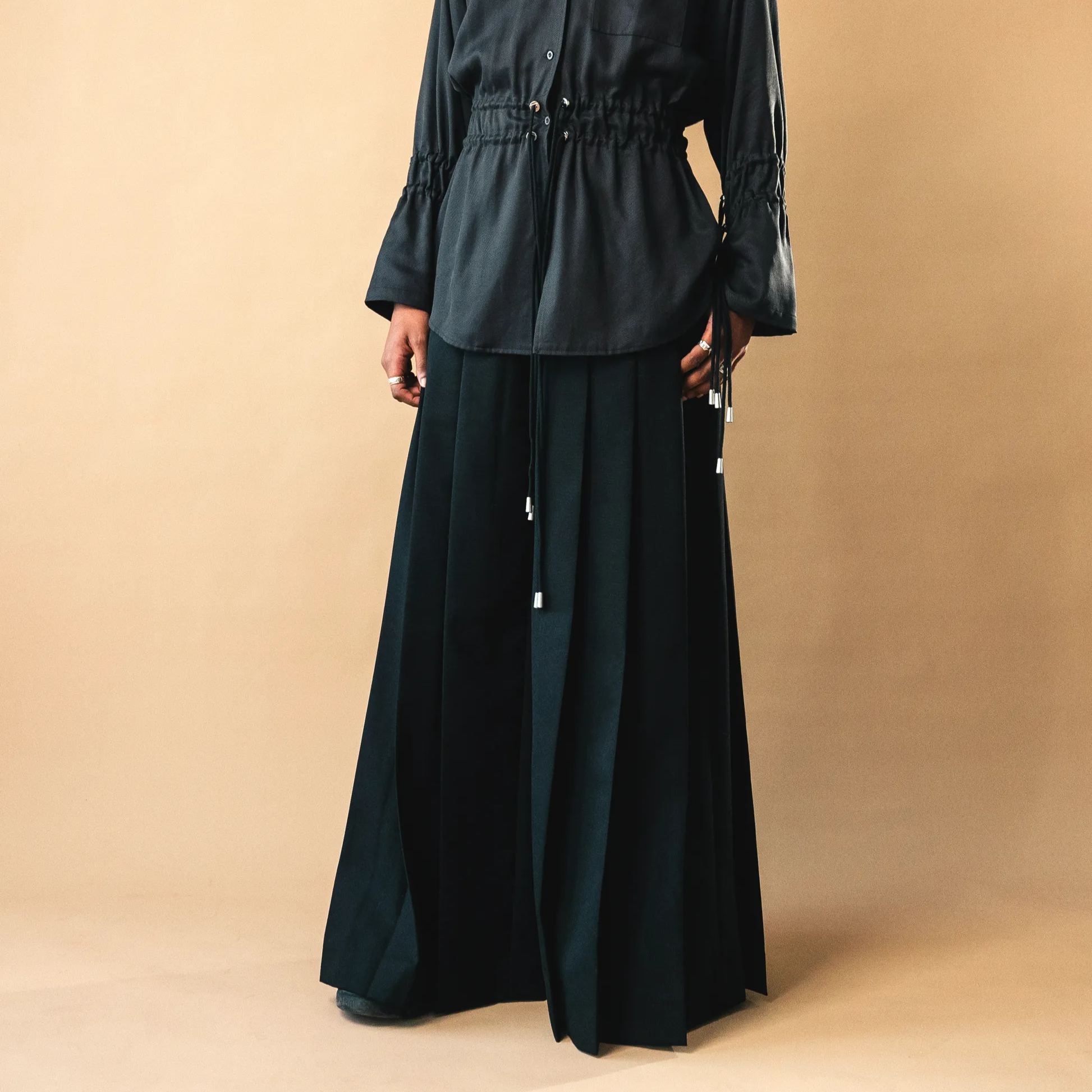 Inspired by the traditional Japanese hakama, these pants feature 8 pleats around each leg, representing the 8 virtues of bushido