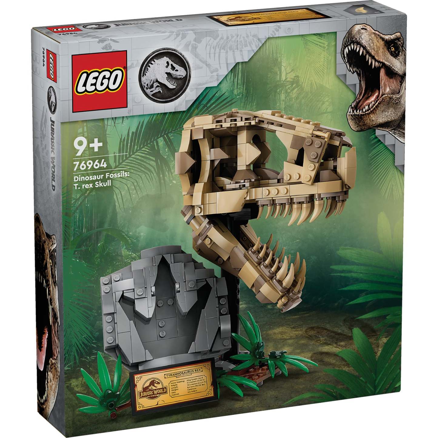 Inspire dinosaur-loving boys and girls or budding paleontologist aged 9 and over with this LEGO® Jurassic World Dinosaur Fossils: T. rex Skull (76964) dinosaur toy for kids. The first Jurassic World set made for display features a skull with an opening jaw, a stand with an information plaque, a hidden ‘amber’ piece at the back of the model and a ‘fossilised’ footprint.