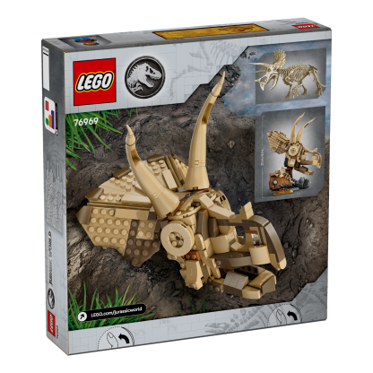 Young paleontologists aged 9 and up can enjoy imaginative Jurassic World play by collecting dinosaur fossils with this Dinosaur Fossils: Triceratops Skull (76969) LEGO® Jurassic World building kit. This model playset in the Dinosaur Fossils display series features a Triceratops skull with an opening jaw, a stand with a rock base, a dig site plate with mini-fossils and excavating tools, a LEGO minifigure, an information plaque and an ’amber’ piece with an encased mosquito.