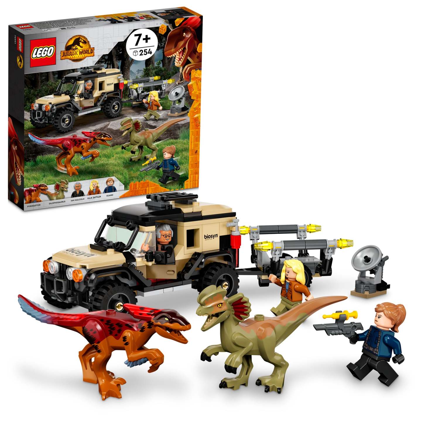 - 3 minifigures and 2 toy dinosaurs – Ian Malcom, Dr. Ellie Sattler and a guard, plus posable Pyroraptor and Dilophosaurus dinosaur figures to play out Jurassic World: Dominion movie scenes
